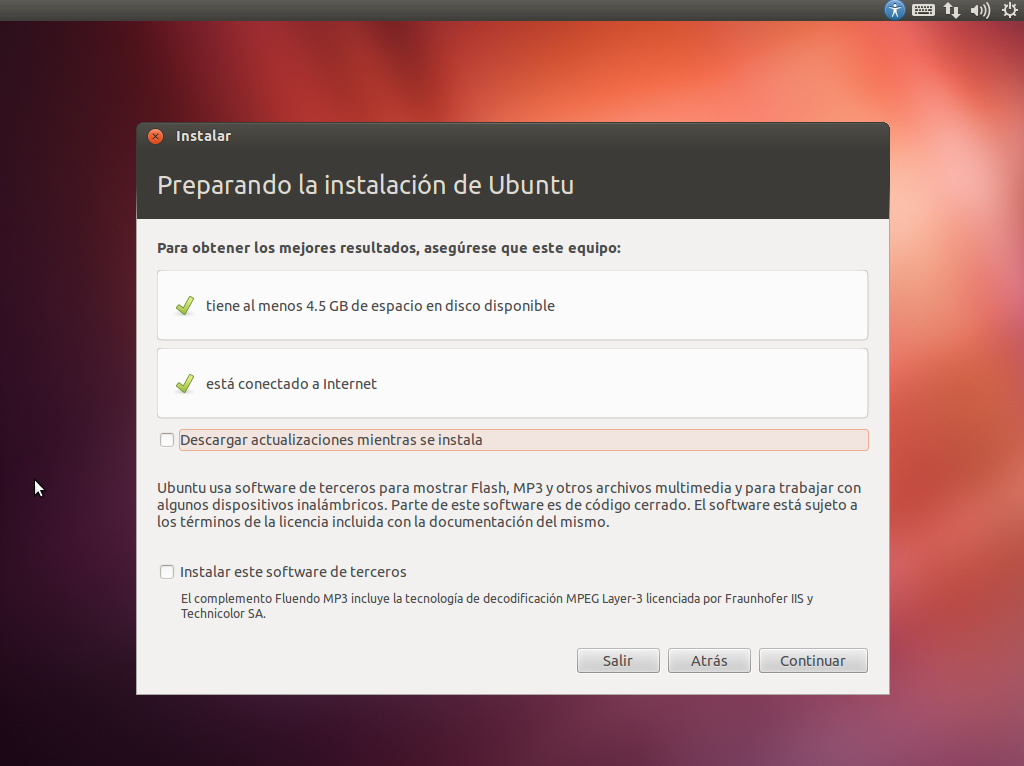 podemos instalar software de terceros (por ejemplo, para reproducir archivos de sonido MP3) pero esta opción ya queda a la elección del usuario, que dependiendo de su filosofia, elegirá una opción u otra. Despues de elegir las opciones que mas nos interesen, pulsamos sobre “Continuar”.