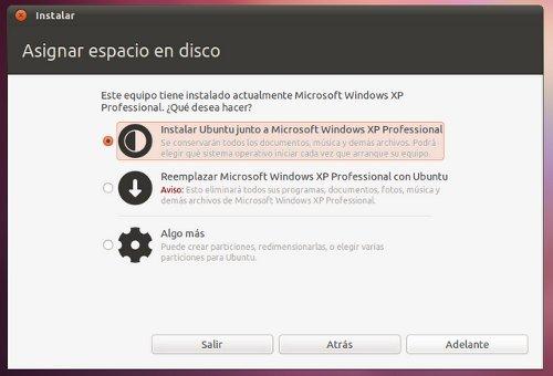 Como supuestamente hemos instalado Windows antes de instalar Linux, deberiamos tener un espacio sin particionar, por lo que elegiremos la opción de “Instalar Ubuntu junto a Microsoft Windows”.