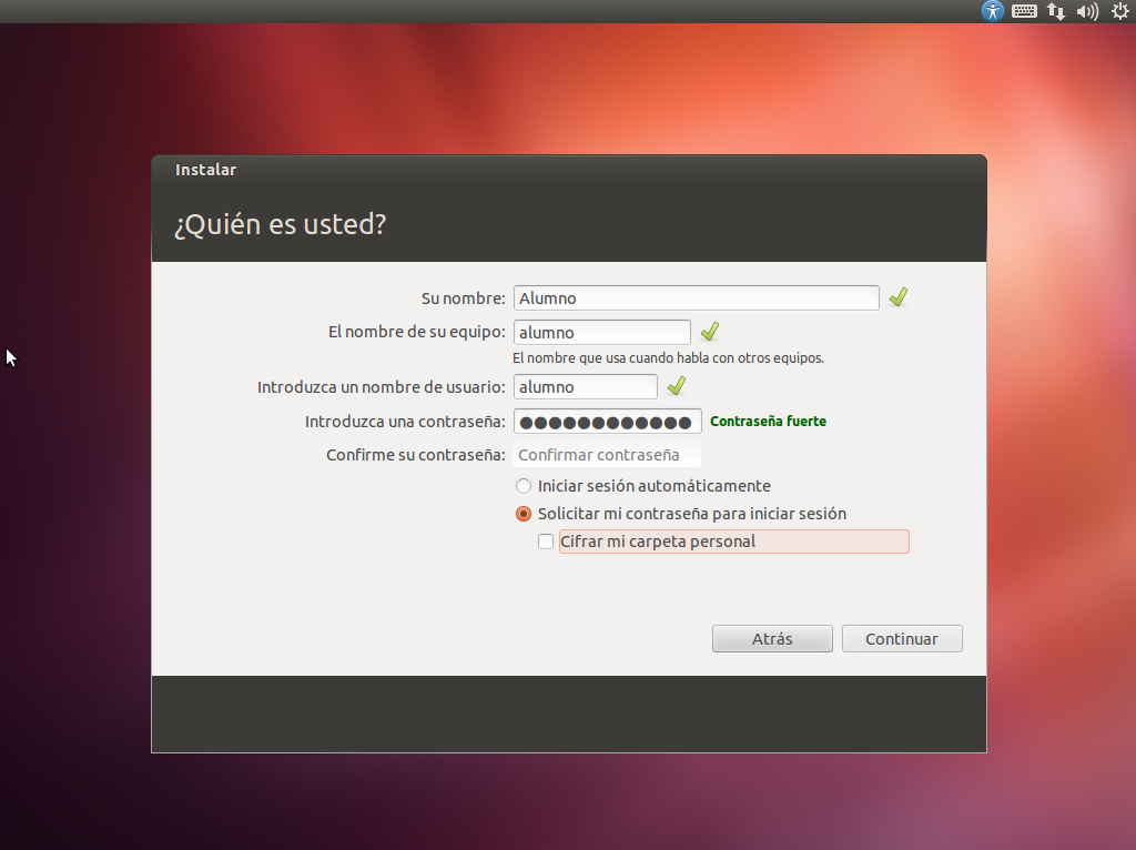 A continuación, se pondrá a instalar la distribución de Linux, y mientras instala nos va a pedir que introduzcamos datos como nuestro nombre, nombre de equipo, contraseña, etc… que iremos rellenando segun nos lo vaya pidiendo.