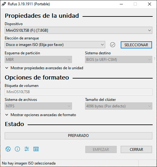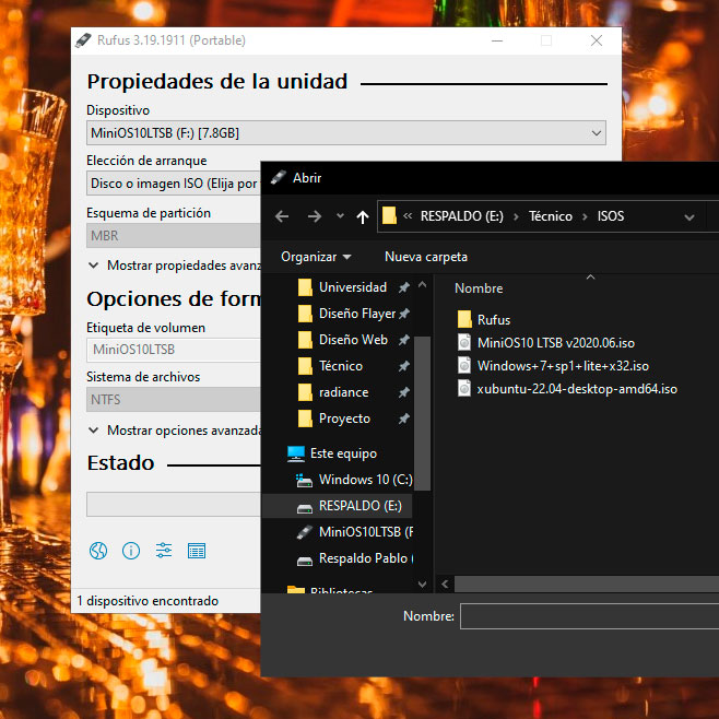 Ya con el programa abierto, procedemos a escoger la unidad de almacenamiento la cual vamos a bootear, posteriormente el ISO del sistema que se desea instalar.