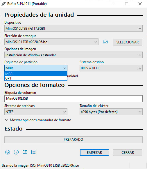 Posteriormente escogemos el esquema de particiones de nuestro equipo y el tipo de sistema.