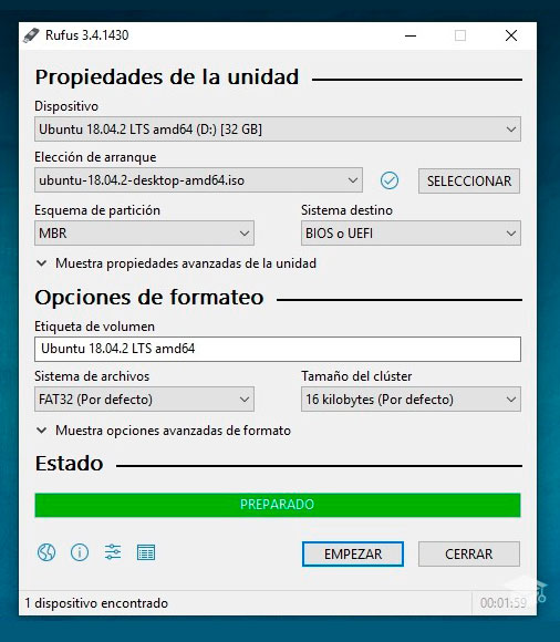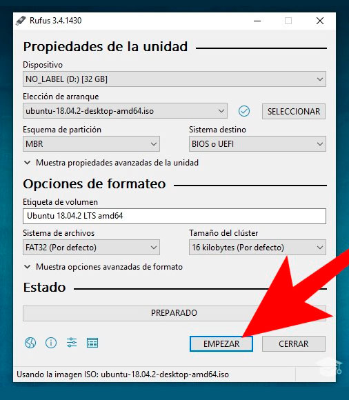 Finalmente presionamos el botón de empezar y el proceso de booteo iniciara mostrando un mensaje de preparado al culminar.