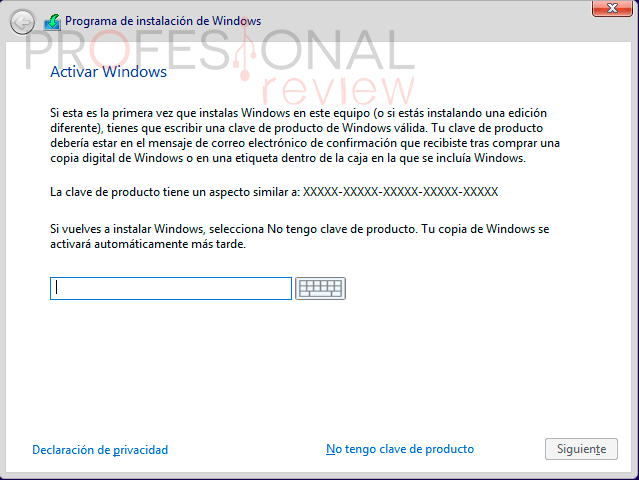 Tras elegir la opción de “Instalar ahora” nos aparecerá la ventana de introducción de licencia del producto. Si disponemos de una clave la podemos introducir ahora, o al finalizar la instalación. En nuestro caso pulsaremos en “No tengo clave del producto” para introducirla más tarde.