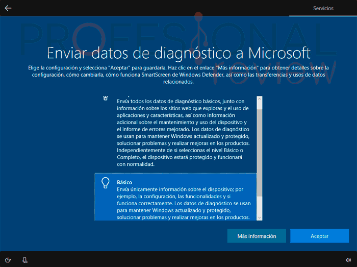 Un dato importante será la llegada a la pantalla de envío de datos de diagnóstico a Microsoft. En esta podremos elegir entre enviar toda la información de lo que hagamos en el dispositivo (Completo) o solamente información técnica (Básico). Tú decides cómo de vigilado deseas estar.