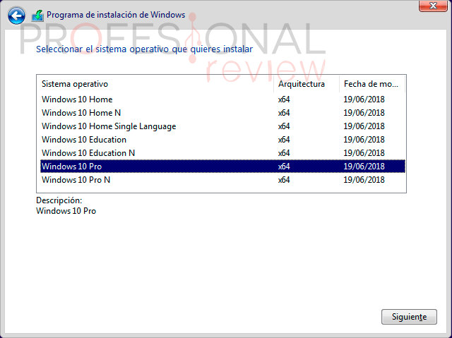 Tras pulsar en siguiente nos saldrá una pantalla en donde debemos elegir la versión que queramos instalar de Windows 10. Según la imagen que se haya descargado, dispondrás de más o menos versiones de Windows 10. En todo caso te recomendamos elegir Windows 10 Home (x86 o x64) o Windows 10 Pro (x86 o x64) según la versión que descargaste cuando creaste el medio de instalación (la licencia más barata de obtener es la de Windows Home).